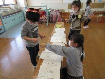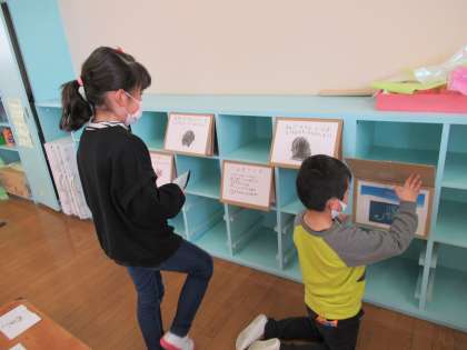 つばめ組の科学博物館がオープンしました。楽しいクイズコーナーがあり友達のつくった問題を考えて答えを用紙に記入し、正解の〇をもらっていました。遊びの中で文字を書いて楽しんでいます。