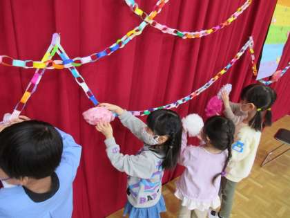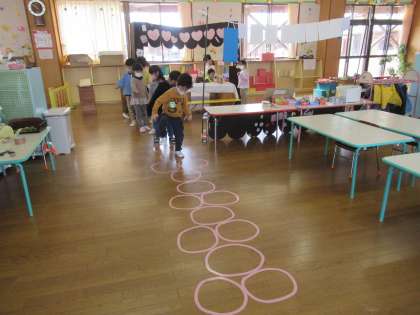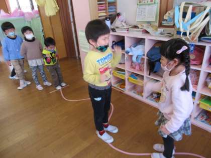 今日のたんぽぽ組の様子 公開日 2022/03/08 更新日 2022/03/08 1日の生活 3月7日(月) 今日はケンパやジグザク跳び、ドンじゃんけんをして遊びました。最初はケンパが難しかったのですが、段々とリズム良く跳べるようになり、ドンじゃんけんでは以前よりもじゃんけんが分かるようになり、次の友達への交代が早くなっていましたよ。 午後からは明日のお別れ会の準備をしました。つばめ組さんの分の椅子を運んだり、飾りつけをしたりしながら明日の本番を楽しみにしている子供たちでした。
