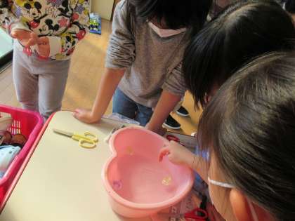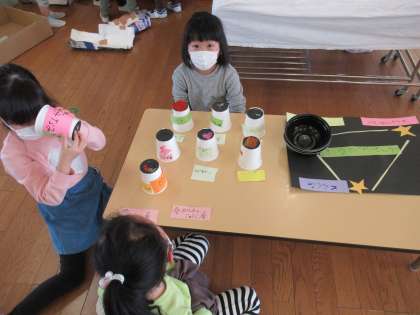 今日のつばめ組の様子 公開日 2022/03/11 更新日 2022/03/11 1日の生活 3月10日 今日は園庭で遊んだり、つばめ組科学博物館で遊んだりしました。実験コーナーでは、折り紙で花の形をつくり花びらを折り、水に入れると花びらが開く実験をして楽しみました。