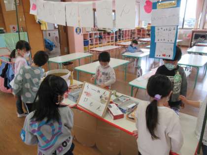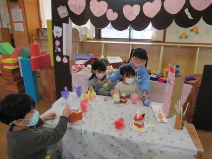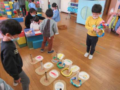 今日はお店屋さんごっこが最後の日だったので、みんなでたくさん遊びました。ラーメンやケーキを食べたり、おもちゃを買ったり輪投げをしたりしました。ケーキ屋さんは「良かったらアイスもどうぞ」とサービスしてくれたり、おもちゃ屋さんでは輪投げが入るまで何度も挑戦させてくれ、たくさんサービスがあり、子供たちも楽しそうでした。みんなでつくった品物もみんなで分けて持って帰ることにしました。
