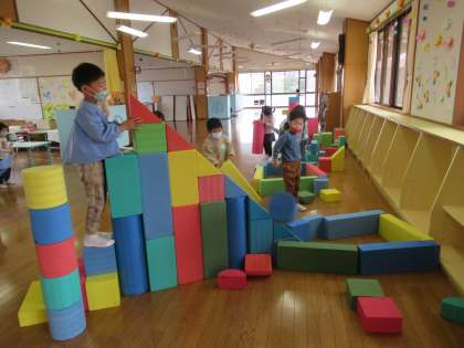 今日はカラー積み木で家や滑り台、カフェなどをつくって楽しんでいました。家には大きなお風呂があり、とても気持ち良さそうに入ったり、滑り台では上から丸い積み木を転がして遊んでいました。カフェは森カフェという名前で営業していましたよ。