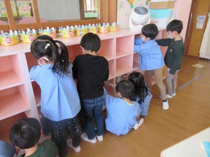 今日はみんなで大掃除をしました。自分のロッカーや下駄箱を掃除しました。1年間使った場所にありがとうの気持ちを込めて隅々まで磨きました。「ピカピカになったよ」と嬉しそうにしている子、新しいほし組になる友達を思って「新しいほしさん、使うもんね」と張り切って掃除している子もいましたよ。