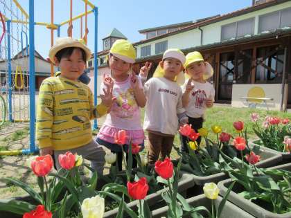 また、チューリップがきれいに咲いている様子を見て「かわいいね」「僕は黄色が好き」とかわいいチューリップや蜜を吸いに来た蝶々を見て喜んでいる子もいましたよ。せっかくなのでチューリップと記念撮影をしました。