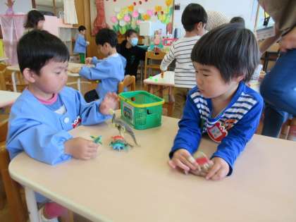 今日は自分の好きな遊びを見つけて遊んだり、友達のしている遊びに興味をもって一緒に遊んだりする姿が見られました。