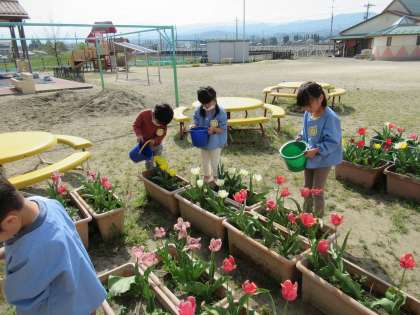 今日は登園した子からチューリップの花に水をあげました。子供たちがたんぽぽ組の時に植えた球根からとてもきれいな花が咲いて「きれいだね」と言いながら水をあげていました。