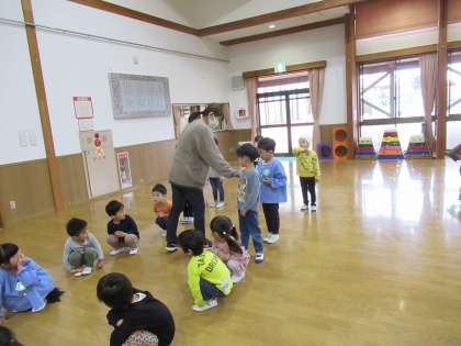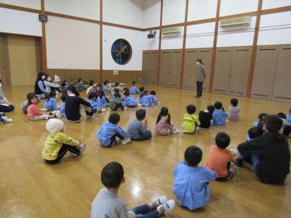 今日は今年度初めての避難訓練がありました。みんなでプレイルームに集まり、ベルの音を聞きました。「お・は・し・も」の確認をしたり、人数確認のときには肩を触られたら次の避難場所にいつでも行けるように「しゃがむ」ことを知らせたりしました。最初はつばめ組やたんぽぽ組のお兄さん、お姉さんがお手本を見せてくれて、ほし組も真似してみました。今後も火災や地震など様々な訓練を行っていきたいと思います。