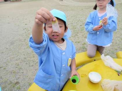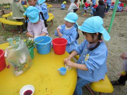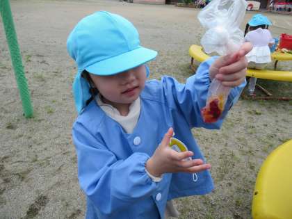 つばめ組の様子 公開日 2022/04/18 更新日 2022/04/18 1日の生活 4月18日(月) 今日はチューリップの花をつぶして色水遊びをしました。 ビニール袋に花を入れ水を少しだけ入れビニール袋をもむと花の色が水に溶けだし色水が出来上がりました。「先生見て、ぶどうジュースできた」もんだ花を取り出すと、黄色の花が透明になっていて「あれ、花の色なくなった」と不思議そうに花を見ていました。普段目にしている花から色が出せる不思議さ、楽しさを味わいました。