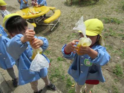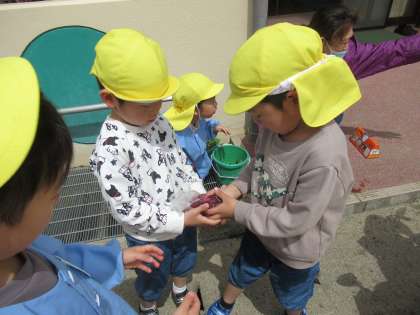 今日は色水遊びをしました。チューリップをカットすると、最初は大事そうに「枯れないようにお水あげる」とカップに移そうとしている優しい子もいましたが、みんなで「もみもみ」タイムが始まると、きれいな色が出てきて「ミカンジュースだ」「こっちはブドウジュース」と嬉しそうに見せ合いっこする姿も見られました。