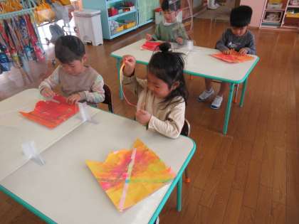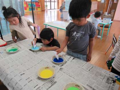 そして2つ目のこいのぼりづくりは障子紙を好きな色に染めました。そっと広げてみるときれいな色が紙いっぱいに広がり「きれい」と嬉しそうな子供たちでした。