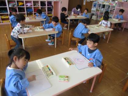 今日はクレヨンの使い方を聞き、みんなで自由画帳に絵を描きました。その後にこいのぼりの製作をし、こいのぼりの体に好きな模様や絵を描きました。
