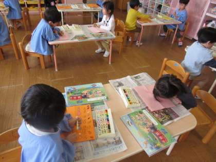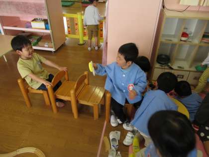 好きな遊びの時間には、ままごとコーナーに椅子を持ってきてパーティーをしていた友達の姿を見て、近くにあった椅子を次々と運ぶ姿が見られ、つなげてバスごっこを楽しみました。楽しそうな雰囲気に、次々と自分の椅子をもってきて並べ、一緒に参加したり、手遊びをしたりして楽しみました。