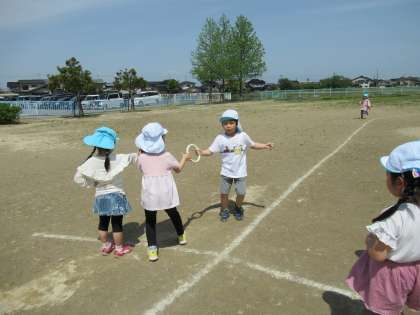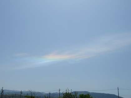 今日ピータパン広場へ行くと「あれ、あそこに色がついてる」と空を指さした子がいたので、みんなでみると、な・な・なんと虹色の雲を発見。「なんで、雨降っていなかったのに虹があるんだろ」「なんか、いいことありそう」としばらく空を眺めていました。その後、リレーをして遊びました。リレーが終わり、空を見てみると虹は消えていました。今日は空の不思議さに触れたつばめ組です。