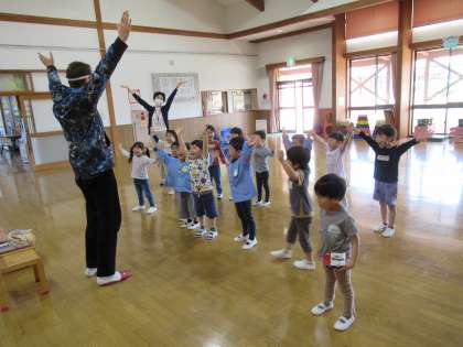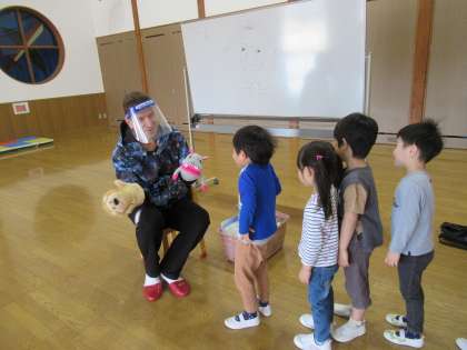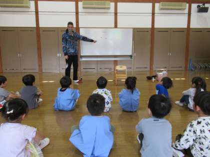 今日のたんぽぽ組の様子 公開日 2022/04/25 更新日 2022/04/25 1日の生活 4月25日(月) 今日は初めての英語教室がありました。最初は「英語難しそう」とドキドキしていた子供たちでしたが、ダン先生と一緒に楽しく英語を話したり、歌を歌って体を動かしたりしているうちに、ニコニコで英語を話すようになっていました。また1つ表現する楽しさを味わったたんぽぽ組の子供たちです。