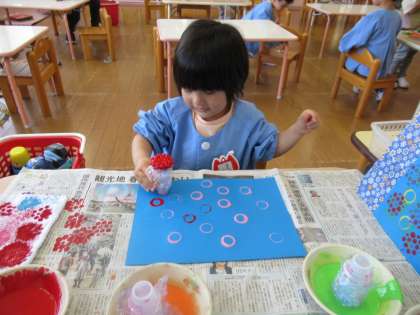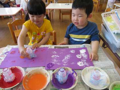 今日はお父さんこいのぼりの体に模様をつけるため、絵の具を使ってスタンプ遊びをしました。「僕はプチプチ模様にする」「私は丸がいい」とスタンプの模様を選んだり「どの色にしようかな」「次は赤にしよう」と好きな色を選び、自分で模様や色を選ぶ楽しさを感じていました。友達が先にしているのを見て「僕もやりたい」と横から見ながら自分の順番を楽しみに待っている姿も見られましたよ。
