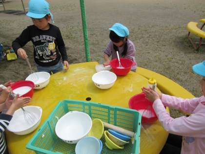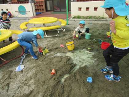 今日はお昼から晴れてきたので、園庭で遊びました。砂場では山をつくり山のてっぺんに火山の穴を開け、「火山が噴火した」と水を溶岩に見立て水を流して遊ぶことを楽しみました。また、石鹸の泡づくりもしました。まだ、水の加減や混ぜ方がわからないようですが、経験を積み重ね試行錯誤しながら楽しめたらと思います。