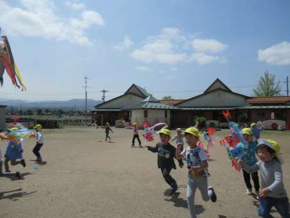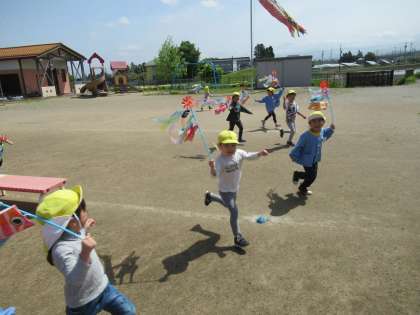 今日のたんぽぽ組の様子 公開日 2022/04/28 更新日 2022/04/28 1日の生活 4月28日(木) 今日は自分でつくったこいのぼりを持って園庭で走ってみました。こいのぼり製作をしているときから「こいのぼり持って走りたい」と話していた子供たち。今日は風も爽やかに吹いていて、風車も回り、こいのぼりもよく泳いでいてとても嬉しそうな子供たちでした。こいのぼりのように強く、たくましく育ってほしいと思います。