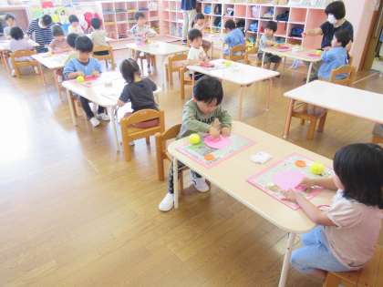 今日はイチゴの製作をし、のりの使い方を知りました。人差し指でのりをすくって、イチゴの全体にのりがつくように丁寧に塗っていましたよ。終わってからも「のりはお母さん指だけだよね」と覚えたことを嬉しそうに繰り返し話していた子供たちです。