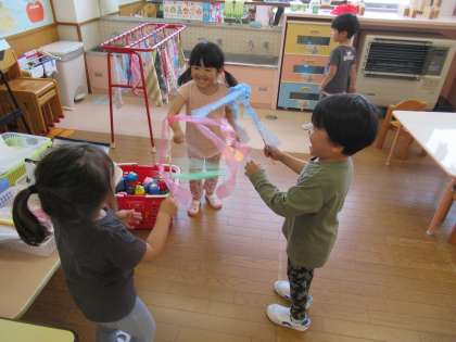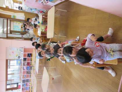 好きな遊びの時間には、広告紙でつくったスティックを持って友達と見せ合ったり、一緒に振って喜んだりと、友達と一緒に同じことをする喜びを感じているようでした。また、全員の椅子を運び、繋げている友達の姿に興味をもち集まってきて、みんなで大型バスの歌を歌ったり、様々な曲に合わせて歌ったり踊ったりしながらバスごっこを楽しみました。