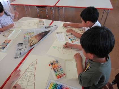 今日はタケノコの絵を描きました。実際触れてみると「ふわふわの毛みたい」「この下の赤いつぶつぶは根っこなんだよ。大きくなったら竹になるよ」と感触を味わったり、自分の知っている知識を友達に知らせたりしながら、絵を描きました。