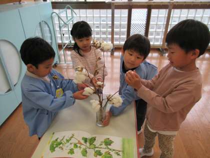 先週読んだ「そらまめくんのあたらしいベッド」のお話の中に綿の木が出てきたので、昨年の年長の保護者からいただいた綿の木を実際に見せてあげると「うわぁフワフワだ」と触って綿の感触を味わいました。なかなか身近にない綿の木に触れることができ、とても貴重な体験ができたつばめ組の子供たちです。