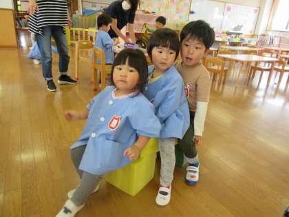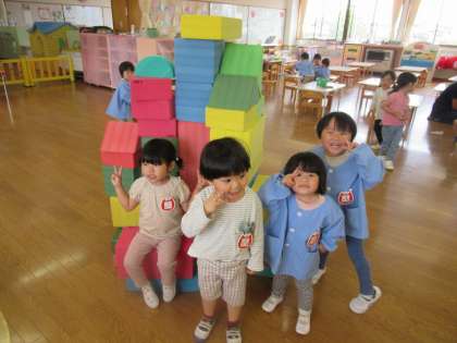 今日はたんぽぽ組さんがしている積み木の遊びに興味をもつ子が多く、ほし組もソフト積み木を出して遊びました。高く積み上げたり、家をイメージして屋根をつけたりと様々な形の積み木を組み合わせて楽しんでいました。友達と取り合いになったり、壊してしまったりとトラブルもありましたが「貸して」や「ごめんなさい」と伝えることを知ると、自分で言葉で伝えようとする姿も見られましたよ。積み木を並べて友達が座ると一緒に座り、自然と「大型バスに乗ってます〜♪」と歌い出していた子供たちです。