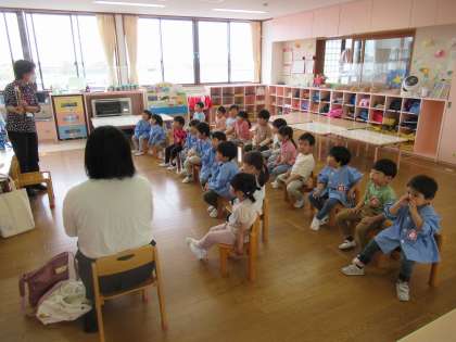 初めてのおはなしの会では、クラスにある絵本とは違う絵本を見ることができ、興味をもって聞いていました。「ありがとうございました」と感謝の気持ちも上手に伝えることができましたよ。