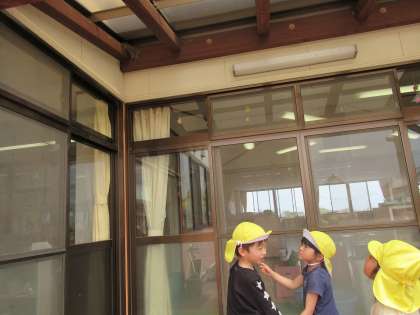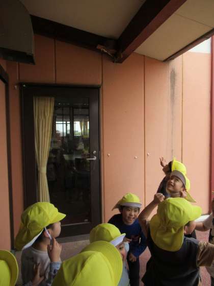 最近、窓の外を見て「あ!ツバメがいる」と話している子供たち。園庭でツバメの巣を発見してからツバメが気になっているようです。今日はみんなでツバメの巣が大きくなっているか見に行きました。以前見たツバメの巣は前とあまり変わらない様子で、他の場所にないか探しに行きました。園舎の周りを探したり、ツバメを追いかけたりして一生懸命探した結果新しい巣が2つも発見しました。見付けると「やったー!」と嬉しそうな子供たち。巣の中には赤ちゃんや卵がいるかもしれないと「しーだよ」と話す子もいました。新しい命の誕生に優しい気持ちをもつ子供たち。早く赤ちゃんツバメが顔を出すことを楽しみにしていました。