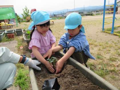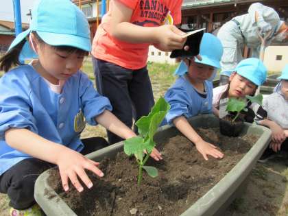 今日はトマト、キュウリ、ナス、オクラの苗を植えました。茎が折れないように、ポットからそっと外し土の中植え、水やりをしました。「トマトはあんまり水をあげないほうがいいんだよ」と野菜に詳しい子がいてみんなで、図鑑を見ながら野菜について調べました。明日から水をやり、野菜のお世話をしたいと思います。