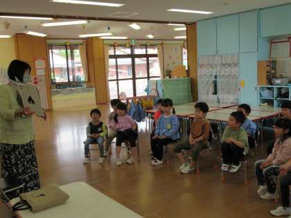 地域の方によるお話の会がありました。季節の本やクイズになっている絵本があり、子供たちは楽しみながら、集中して話を聞くことができました。地域の方と触れ合える貴重な時間でした。
