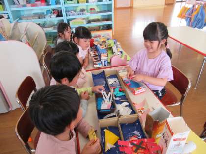 家族で水族館へ行った経験からミニ水族館づくりが始まりました。そして今日はイルカショーが遊びの中に出てきました。イルカショーをしている子はショーのお姉さんになりきって「次はイルカのジャンプです」となりきって楽しんでいました。見ているお客さんも楽しそうでした。