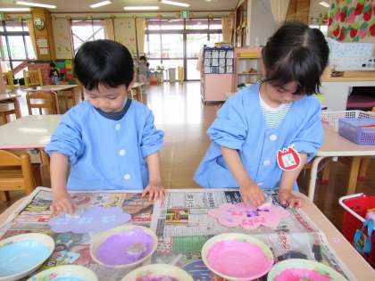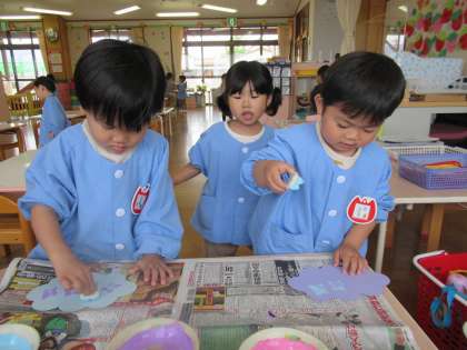 今日はアジサイの製作で絵の具のスタンプ遊びをしました。自分で好きな色を選んで画用紙に何度も花の形を押していくと段々ときれいな模様になり、嬉しそうな子供たちでした。