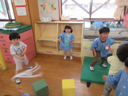 好きな遊びの時間には、積み木で椅子をつくった子がいたことから、数人で座ってみて「何を見ようか。みんなで踊り見る」と問いかけると「じゃあバスの歌で」とリクエストがあり、みんなでバスごっこに合わせて歌ったり、スティック棒を持って様々な曲に合わせて踊ったり歌ったりして楽しみました。先生の真似をしてアイテムを持ったり、先生の真似をして一緒に踊ったりと嬉しそうな子供たちでした。
