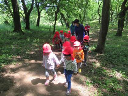 遠足楽しかったよ! 1 (ほし組) 公開日 2022/05/18 更新日 2022/05/18 1日の生活 5月18日(水) 今日はほし組さんにとって初めての遠足で、呉羽青少年自然の家に行ってきました。大きなバスに大喜びで、バスの中で歌や手遊びをしたり、持ち物確認クイズをしたりして楽しみながら行きました。 到着して入所式をした後は、みんなで集合写真を撮り、散策に行きました。「ジャングルみたい」「木がいっぱいある」と興味津々な子供たちでした。