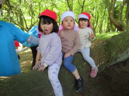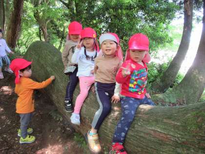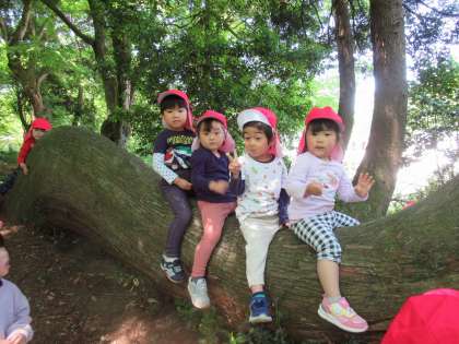 遠足楽しかったよ! 2 (ほし組) 公開日 2022/05/18 更新日 2022/05/18 1日の生活 散策をしていると、クネクネ曲がった大きな面白い木があり、そっと触って見ているうちに「登りたい」との声が聞かれ、登ってみたい子が順番に大きな木に乗ってみました。とても嬉しそうに友達と乗っていましたよ。様々な形の木の枝を見つけたり、かわいいお花を見つけたり、落ちている木の実を拾ったりしてたくさん自然の中で遊んできました。近くにブランコの遊具もあり、順番に乗って遊びました。