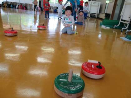 外で遊んだ後は、室内の遊具で遊びました。カーリングの遊具やスラックラインがあり、ストーンを転がしたり、先生に補助してもらいながら渡ったりして遊びました。