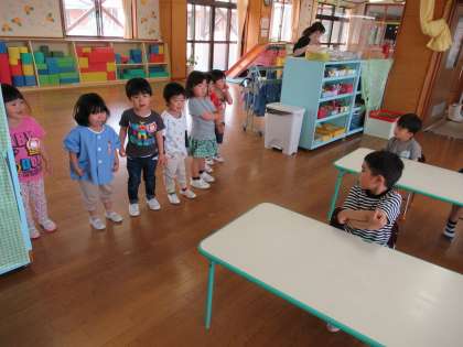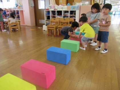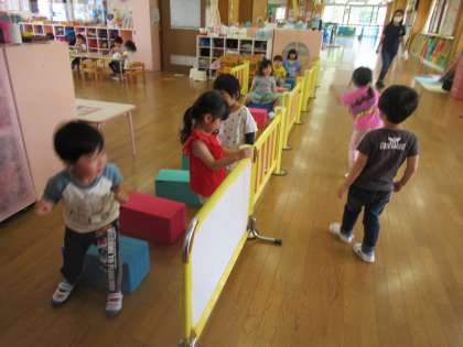 昨日の帰りの会の振り返りで、バスごっこの話をしていると「ぼくも乗りたかった」という声が聞かれ、積み木でつくったバスが小さかったことを相談すると「もっと長くすればいい」と意見が聞かれ、今日はみんなで大きなバスをつくって遊ぶことになりました。ほし組の前にある積み木を並べてみると大きな積み木が少なく困っていたので、たんぽぽ組さんに相談してみることを提案すると「積み木貸してください」「大きいバスつくるから」と上手に伝えていた子供たち。一生懸命積み木を運び、並べたり数を数えたりしていました。仕切りを横につけてバスの雰囲気を出すと「まだ壁が欲しい」と言っていたので、足りないところは段ボールをつけてバスをつくりました。大きなバスに嬉しそうな子供たちでした。