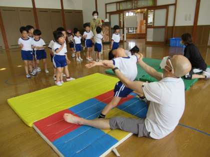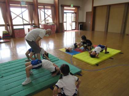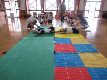 お芋コロコロ、前転、開脚前転、年長児はブリッジもしました。