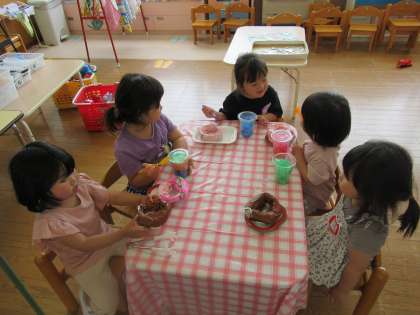 今日はドーナツ屋さんが人気で「いらっしゃいませー」「何にしますか」と店員になったり「これください」と注文して友達と一緒に「おいしいね」と顔を見合わせながら嬉しそうに食べていました。