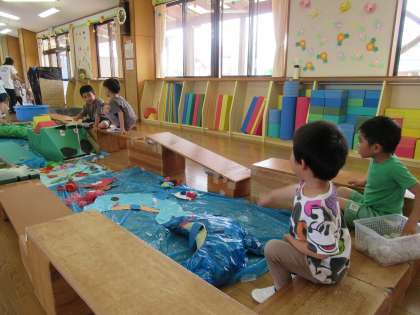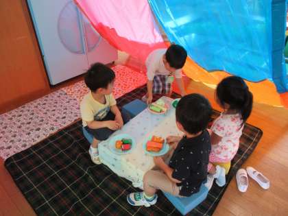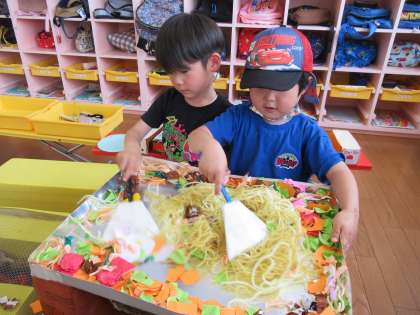 今日のたんぽぽ組の様子 公開日 2022/05/27 更新日 2022/05/27 1日の生活 5月26日(木) 今日は以前からつくっていた焼きそばやバーベキューをして遊びました。具材を入れて混ぜたり、友達や先生に分けてあげたり、大忙しでした。テントでは自分が食べたいものを持ち寄り「一緒に食べよう」「美味しいね」と友達や先生を誘ってと一緒に食べる姿が見られました。橋では大きなワニに向かって餌を投げて遊ぶ姿も見られました。自分でつくったもので遊ぶ充実感を味わっている子供たちです。