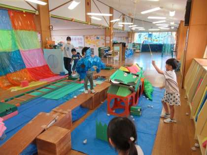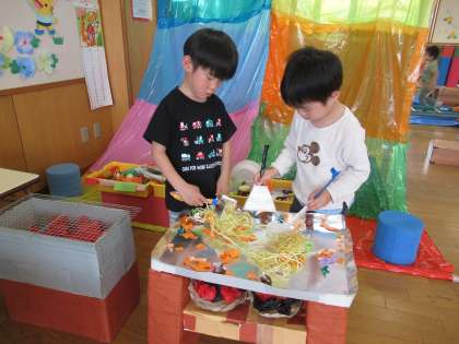 今日の好きな遊びの時間には釣りや焼きそばづくりなど、思い思いに遊びを楽しんでいる姿が見られました。ワニに向かって餌を投げている子供たちは口が開くタイミングを見計らってよく観察して投げていました。今日は友達同士でワニの口の開け閉めをする順番を決める姿も見られました。「次は僕がしたい」と話す友達に「○○ちゃん、どうぞ」と優しく紐を渡す姿も見られて相手を思って遊ぶ姿に成長が感じられました。