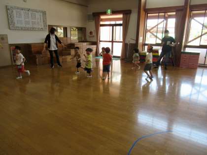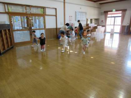 今日はみんなでオオカミさんという遊びをしました。最初は先生がオオカミになり、オオカミに食べられないように逃げることを楽しみ、その後はオオカミに捕まった子とオオカミを交代しながら遊びました。オオカミの役になることも楽しかったようで、オオカミになりきって喜んで体を動かしたり、表現したりすることを楽しみました。