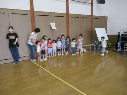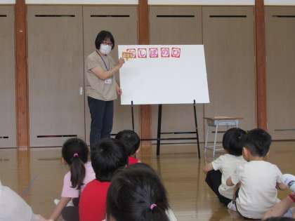 今日は歯磨き集会がありました。園長先生のパネルシアターでは歯や歯磨きの大切さを教えてもらいました。〇×クイズでは歯にまつわる問題が出され、小さい友達は大きい友達と手を繋いで問題に答えました。