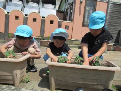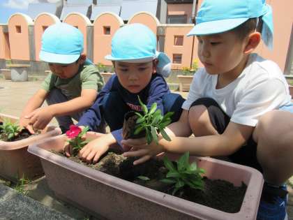 玄関前にあるプランターに花の苗を植えました。「これ、なんていう花かな」と興味をもって植えていました。どんな花が咲くのか楽しみな様子でした。