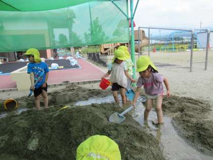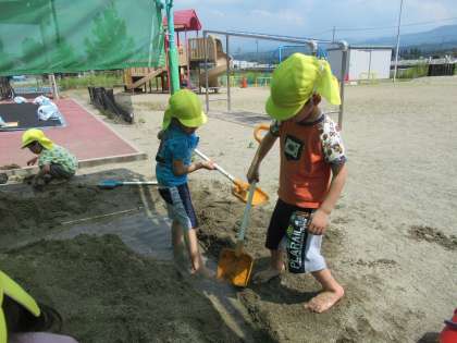 今日は砂場で水を流して遊びました。つばめ組と遊んでからこの遊びが大好きになった子供たち。掘ったり、水を流したり、大忙しでたくさん遊びました。途中で水が止まっているところを発見した子供たちに「どうしたら流れるかな」と聞いてみると「低くすればいいんだよ」という答えが返ってきました。「低くってどうするの」とまた聞くと「掘ればいいってことだよ」と別の子から答えが返ってきて、どんどん掘り進めてみると、川はすいすい流れていきました。遊びの中で水が流れる仕組みまでいつの間にか学んでいる子供たちでした。
