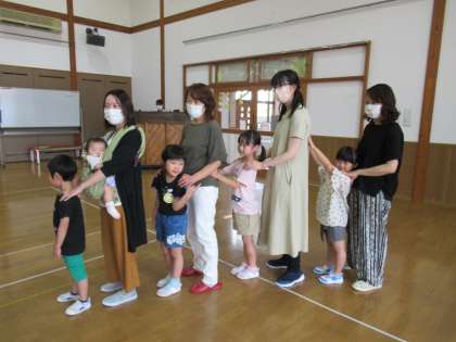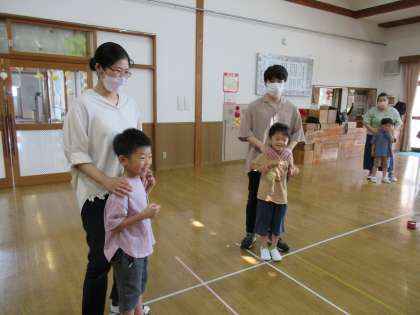 今日は保育参観がありました。つばめ組の水族館を見ていただいたり、親子で触れ合い遊びをして遊びました。おうちの人と一緒に『猛獣狩り』や『じゃんけん列車』をすることができ嬉しそうな子供たちでした。