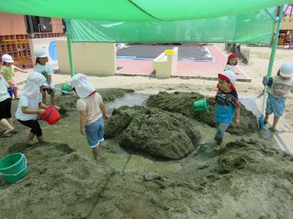 今日も裸足になってどろんこ遊びを楽しみました。砂場に出るとすぐにバケツを持ち、水を汲んでは運ぶ子供たち。早く水を汲みたいという思いから、水汲みの場所に押し寄せる姿もありましたが「順番に汲んだらいいね」と声をかけると「僕上手?」「見て、並んでるよ!」と先生にアピールしながらとっても上手に順番に並んでいた子供たちです。泥水の中に入ると「気持ちいい〜」と何度も声に出して喜んでいました。「ここを深くしよう」と穴を掘ったり「いらっしゃいませ〜」とスープ屋さんを開いたりして楽しんでいましたよ。