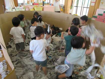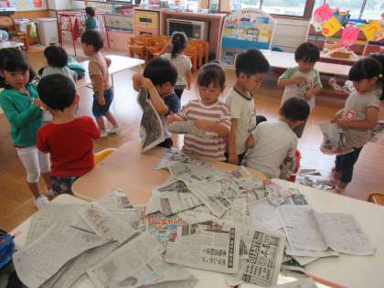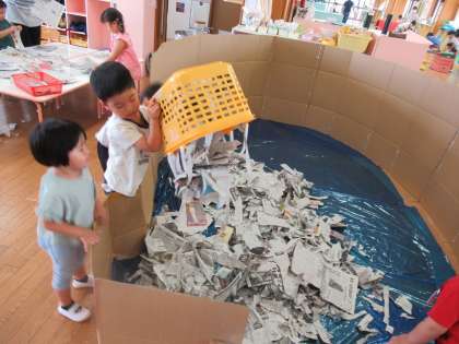今日は朝からみんなで新聞紙をたくさんちぎって遊びました。なぜちぎっていたかというと、登園すると部屋の中に大きなプールができていたからです。カゴがいっぱいになるとプールに入れ「もっと入れよう!」と張り切ってちぎっていました。プールにたくさん新聞が入ると「みんなで入ろう!」と大喜びで入り、友達や先生と新聞をかけ合ったり、泳ぐ真似をしたりして「楽しい」「キャー」ととっても楽しんでいました。汗だくになって遊んだ後は、水着に着替えて本当のプールに入って遊びましたよ。