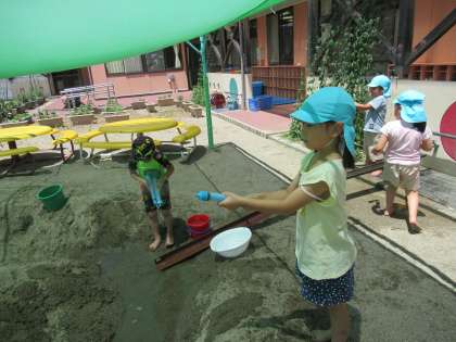 今日はプール遊びをしました。友達とワニになってプールの中を歩いたり、宝探しゲームをしたりしました。プールに入れない子供たちは砂場のテントの下で水鉄砲をして遊びました。