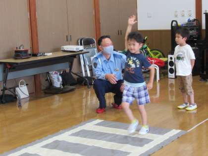 幼児交通安全教室がありました。その2 公開日 2022/07/01 更新日 2022/07/01 1日の生活 お話を聞いた後は模擬道路で横断歩道を渡る練習をしました。信号が青に変わったら、右・左・右をしっかり確認して手を挙げて渡ることを実践していました。警察官の方も一緒にいたことで、更に真剣な様子の子供たちでした。