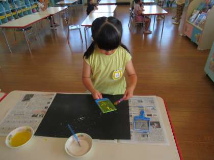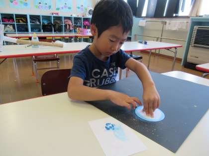 昨日プラネタリウムを観覧して、星や宇宙に興味をもったつばめ組さん。今日はブラシを使ったスパッタリングで宇宙を描きパステルでブラックホールや惑星を描きました。